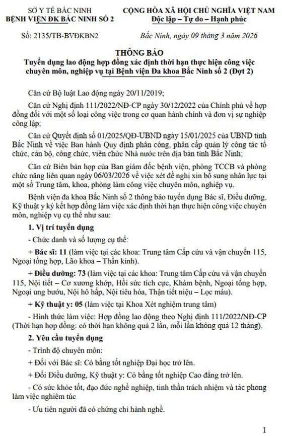 Bệnh viện đa khoa Bắc Ninh số 2 thông báo tuyển dụng Bác sĩ, Điều dưỡng, Kỹ thuật y ký kết hợp đồng làm việc xác định thời hạn thực hiện công việc chuyên môn, nghiệp vụ cụ thể như sau: