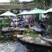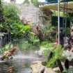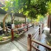 Xung quanh hồ cá là những chiếc bàn, ghế được đẽo gọt công phu từ những phiến đá lớn nhập về từ Ninh Bình và những hàng ghế bằng sắt được sắp xếp gọn gàng. Giữa quán là cây si có tán lá rộng tỏa bóng mát cho khuôn viên bên ngoài của quán.