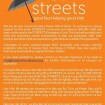 STREETS INTERNATIONAL (STREETS) là một sáng kiến doanh nghiệp xã hội toàn cầu dành cho trẻ em đường phố và thanh thiếu niên có hoàn cảnh khó khăn khác. Chương trình STREETSprogram và Restaurant Café khai trương tại Hội An, Việt Nam vào tháng Giêng năm 2009, cung cấp một tương lai của phẩm giá thông qua đào tạo nghề và ẩm thực. Để biết thêm thông tin, vui lòng truy cập trang web của chúng tôi: www.streetsinternational.org.
