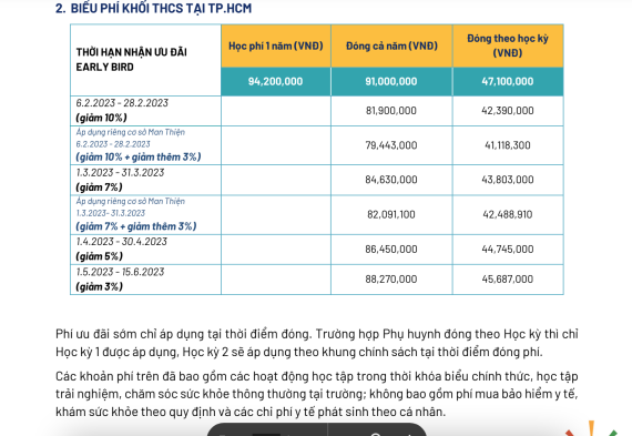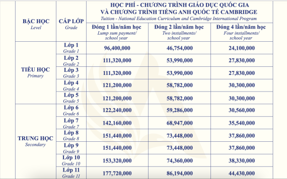 Dưới đây là bảng học phí của trường công bố năm 2023 - 2024 để quý phụ huynh tham khảo.