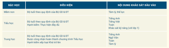 Ở bước này, học sinh đăng ký vào lớp 1 phải tham gia kỳ tuyển sinh đầu vào: khảo sát kỹ năng cơ bản.