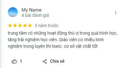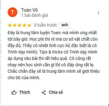 - Thầy Khuê và các giáo viên đều có chuyên môn cao, nhiều năm giảng dạy TOEIC, luôn tận tâm giúp đỡ học viên đạt kết quả tốt nhất. Trung tâm áp dụng phương pháp "Học là hành", giúp học viên rèn luyện kỹ năng thực tế thông qua các hoạt động tương tác, bài tập thực hành và mô phỏng đề thi.