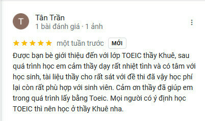 Với bề dày kinh nghiệm hơn 10 năm giảng dạy của thầy Khuê, TOEIC Thầy Khuê đã trở thành trung tâm tiếng Anh được nhiều học viên đánh giá cao và tin tưởng khi tìm trung tâm luyện thi TOEIC uy tín tại TP.HCM. Các khóa học TOEIC của trung tâm nổi tiếng bởi lộ trình học tinh gọn, kiến thức đi sâu vào trọng tâm, giúp học viên nâng cao cả 4 kỹ năng nghe, nói, đọc, viết.